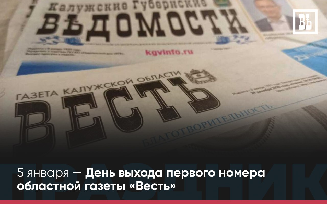 35 лет назад, 5 января 1991 года вышел в свет первый номер областной газеты «Весть». Редакция была создана 27 декабря 1990 года постановлением Исполнительного комитета Калужского областного Совета народных депутатов как альтернатива органу Областного комитета КПСС газете «Знамя». Первым редактором газеты стал Алексей Золотин. Его имя сегодня носит региональный творческий конкурс, который проводит Калужское региональное отделение Союза журналистов России.
