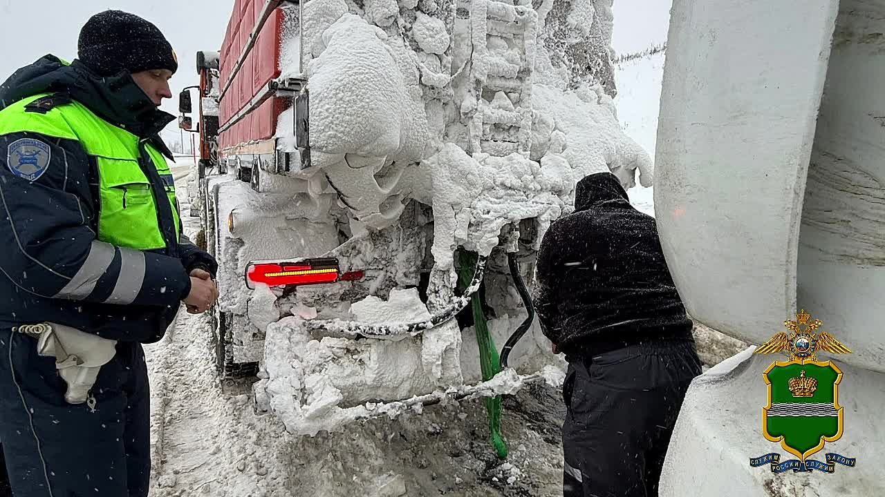 Полицейские помогли закрепить фуру к снегоуборочной машине, которая смогла вытащить грузовой автомобиль из снежной ловушки. На всё ушло около часа. Водитель поблагодарил всех за помощь.
