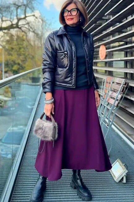 - Городской стиль: Расклешенная юбка темно-фиолетового оттенка в сочетании с угольно-синим свитером с высоким горлом создаст эффектный наряд на каждый день. Укороченная куртка интересного кроя и тяжелые «байкерские» ботинки завершат образ, а миниатюрная меховая сумочка добавит изюминку.