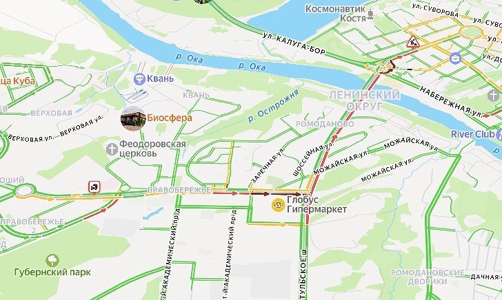 Пробка на улицах Генерала Попова и Фомушина растянулась на два километра. Также образовался значительный затор на Тульском шоссе, где движение замедлилось до минимальной скорости.