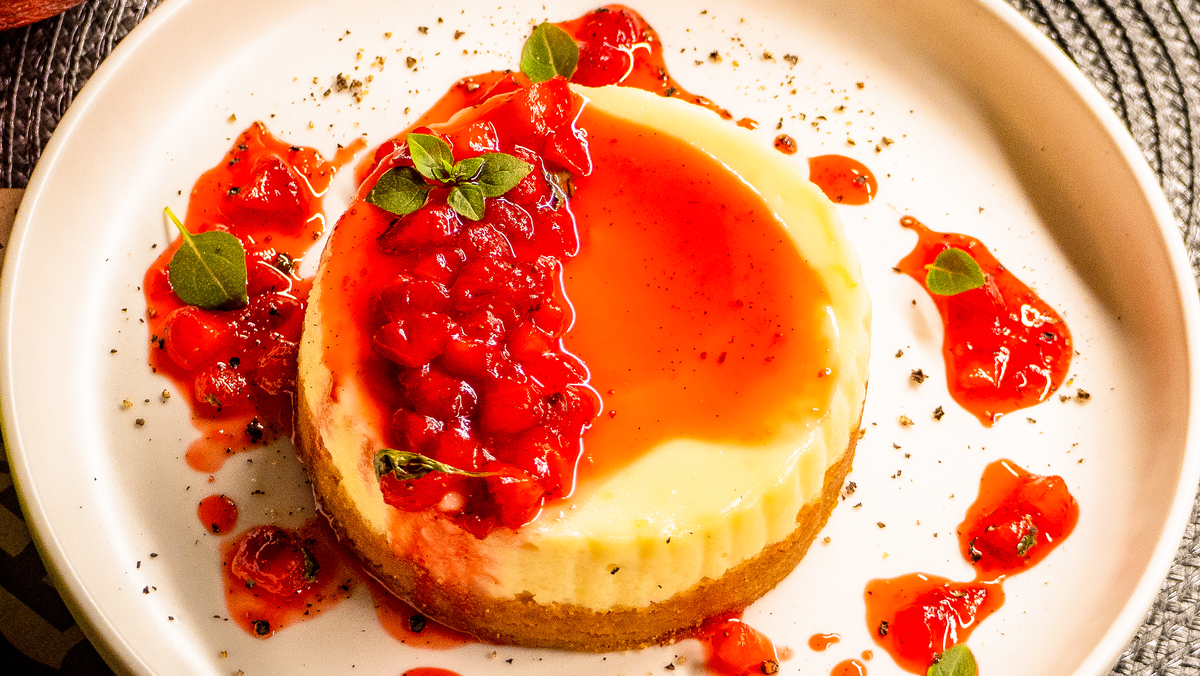 В глубокую чашу блендера поместить печенье и растопленное сливочное масло. Измельчить до состояния мелкой крошки.Застелить противень пергаментом. Установить металлические кольца и равномерно распределить крошку по дну форм, плотно утрамбовав ее.В отдельной миске соединить творожный сыр, 60 г сахара, цедру лимона и яйцо. Хорошо перемешать до однородной массы.С помощью ножа извлечь зернышки из стручка ванили и добавить их в сырный крем. Перемешать венчиком.Подготовить бортики для чизкейка из пергамента и установить их в кольца. Наполнить формы сырным кремом.Выпекать чизкейк в разогретой до 180°С духовке в течение 20 минут.Тем временем в сотейнике смешать оставшийся сахар, сок лимона и остатки стручка ванили, довести до кипения.Клубнику нарезать небольшими кубиками и добавить в сотейник вместе с нарезанным базиликом.Кипятить клубничный состав на небольшом огне в течение 3 минут и дать остыть.Постепенно извлечь чизкейк из форм и дождаться его полного остывания.Перед подачей полить десерт свежеприготовленным клубничным конфитюром, украсить базиликом и щепоткой молотого перца для контраста.Этот чизкейк станет настоящим украшением любого стола и подарит ни с чем несравнимые гастрономические удовольствия!