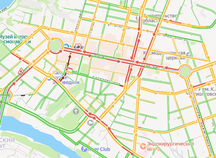 Заторы уже наблюдаются на улицах Кирова, Кутузова, Ленина, Московской, Плеханова, Гагарина.