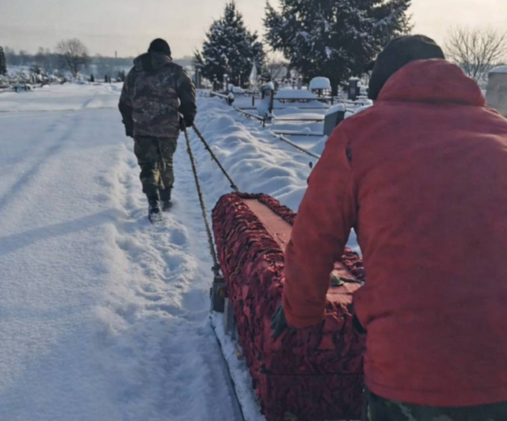 В воскресенье, 18 января ресурс "Козельск - новости города" опубликовал фотографию, на которой сотрудники ритуальной службы доставляют гроб с умершим к месту захоронения на санках.