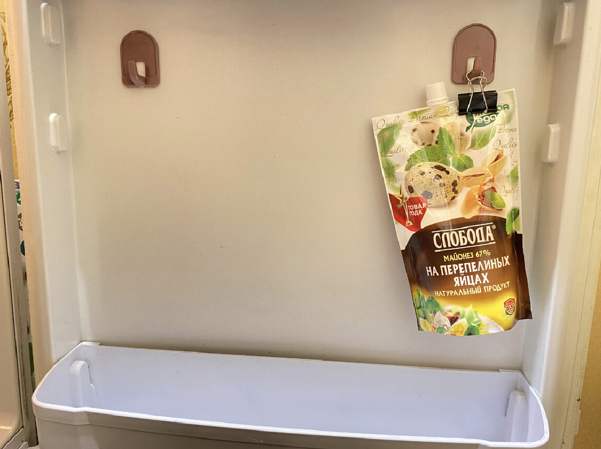 - Крючки для хранения: Приобретите крючки с клейкой основой и прикрепите их к полкам. Это поможет освободить пространство для других продуктов, ведь вы сможете повесить пакетики с соусами на крючки.