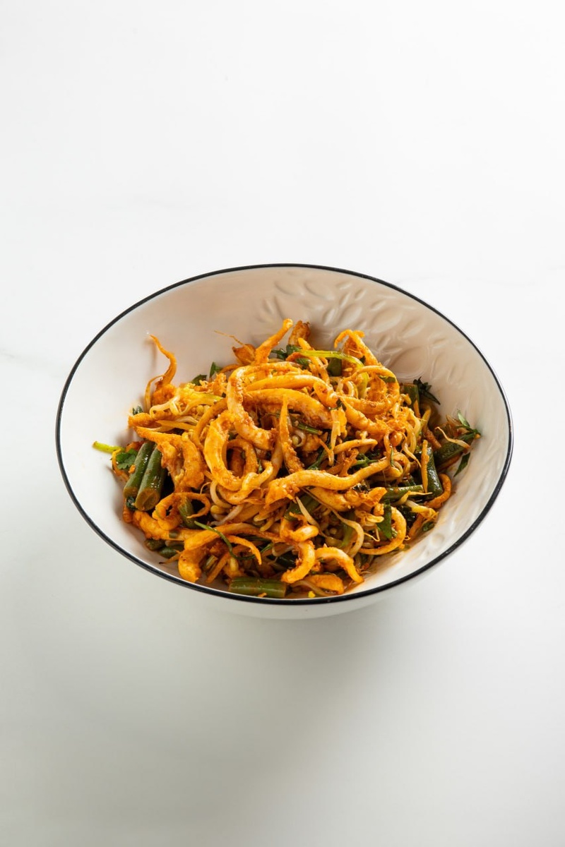 - Щупальца кальмара с чили и молодым чесноком (630 ?) — быстрообжаренные, хрустящие и острые, идеально для любителей морепродуктов.
