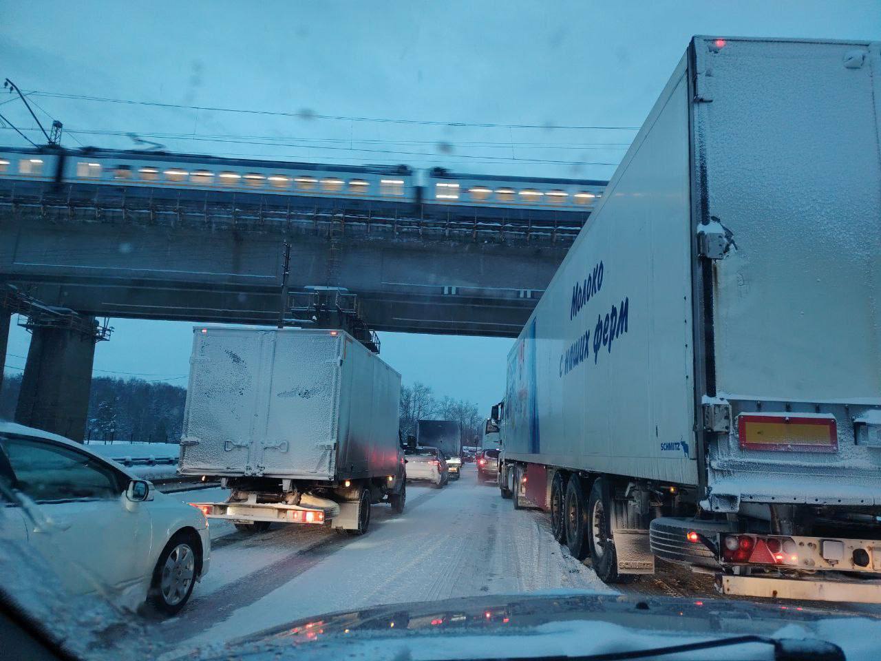 Пассажиры выходят из автобусов на Калужском шоссе и идут пешком по сугробам из-за сильного затора. На МКАДе ситуация не лучше, мощный снегопад привел ко множеству ДТП. Фуры не могут въехать на дорогу.
