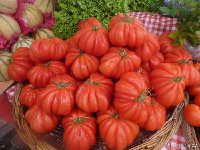 Характерная особенность сорта — мощный куст и крупные, многокамерные плоды. Визуальная ребристость и гофрированная поверхность добавляют декоративности, особенно при равномерном питании и хорошем освещении. Мякоть плотная и сочная, что делает томаты пригодными для салатов и свежего потребления.