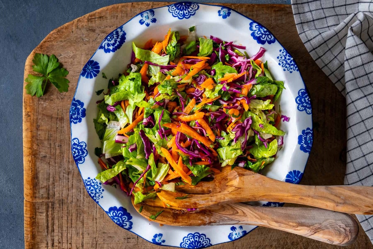 Начните с нашинкования капусты и тщательного удаления избыточной влаги. После этого натрите морковь, смешайте всё вместе и добавьте нарезанный листовой салат. По вкусу ароматизируйте зеленью, лимонным соком, солью и перцем. Если планируете завернуть салат в лаваш, можно использовать освежающий чесночный майонез.