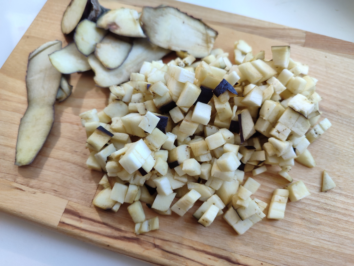 Изучив процесс, становится ясным, что не обязательно запекать баклажан в духовке – это займет слишком много времени. Баклажан нарезают кубиками, и можно жарить на сковороде. Главное – аккуратно и быстро обжарить, чтобы овощи сохранили текстуру.