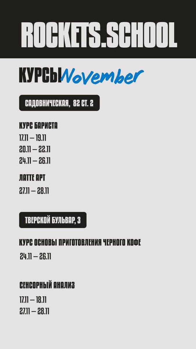 В этом месяце ROCKETS.COFFEE предлагает множество увлекательных курсов и мастер-классов, которые порадуют как новичков, так и опытных любителей кофе. Узнайте, что нас ждет в ноябре!