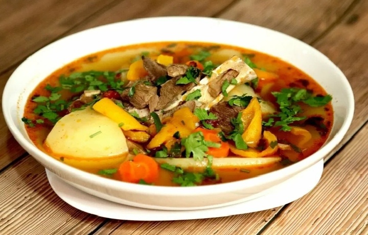 - Ингредиенты: Основу супа составляют субпродукты: сердце, печень, легкое и рубец, которые обязательно сочетает с мясом (чаще всего говядиной или бараниной). Обилие свежей зелени также является непременным условием.