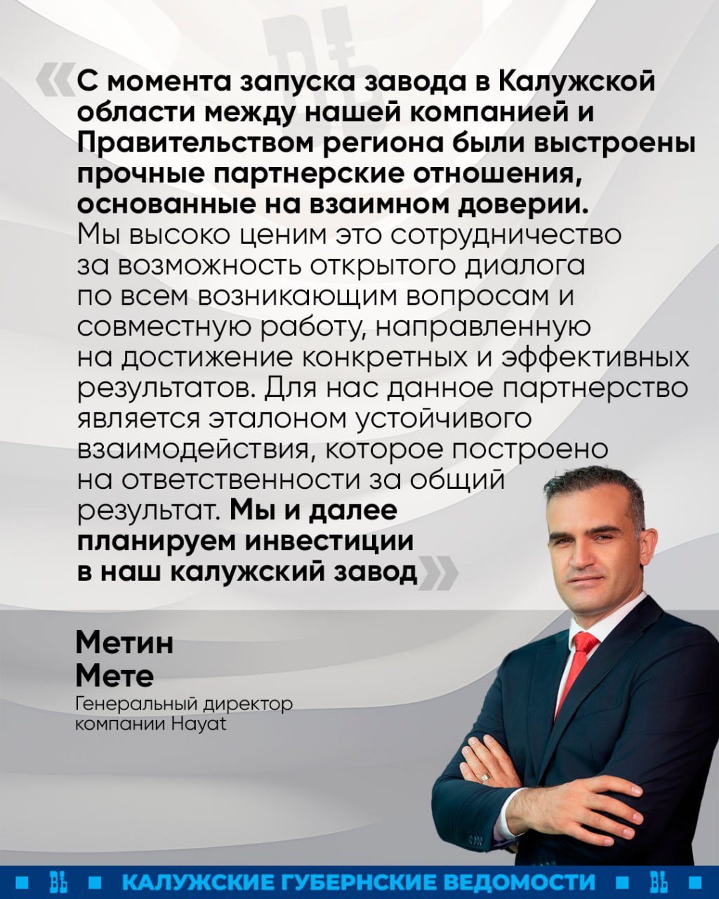 О комфортном ведении своего бизнеса на территории Калужской области рассказал гендиректор компании производителя туалетной бумаги, полотенец и салфеток «Хаят» Метин Мете на встрече с губернатором Владиславом Шапшой. Мете также отметил, что рекомендует турецким партнерам открывать производства на калужской земле.