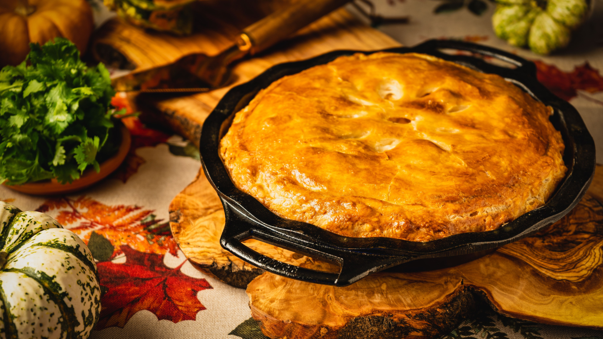 Накройте пирог вторым пластом. Защипните края. Можно смазать тесто взбитым яйцом или растопленным сливочным маслом — так получится красивее. Выпекайте в духовке полчаса на 190 градусах, советует «Лайфхакер».