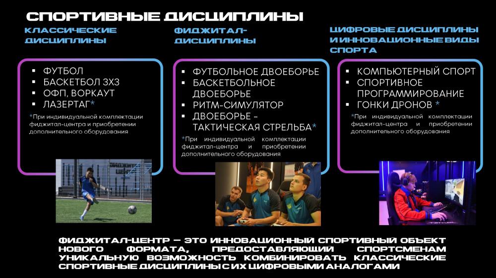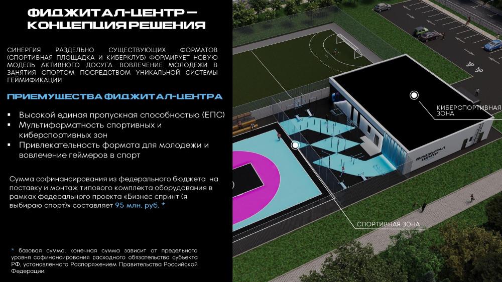 Также проект фиджитал-центра включает в себя площадку для мини-футбола 2040 метров, площадку для баскетбола «3 на 3» и площадку для занятия воркаутом. Общая площадь застройки составляет более 3 000 квадратных метров. Завершить строительство объекта планируется к концу текущего года.