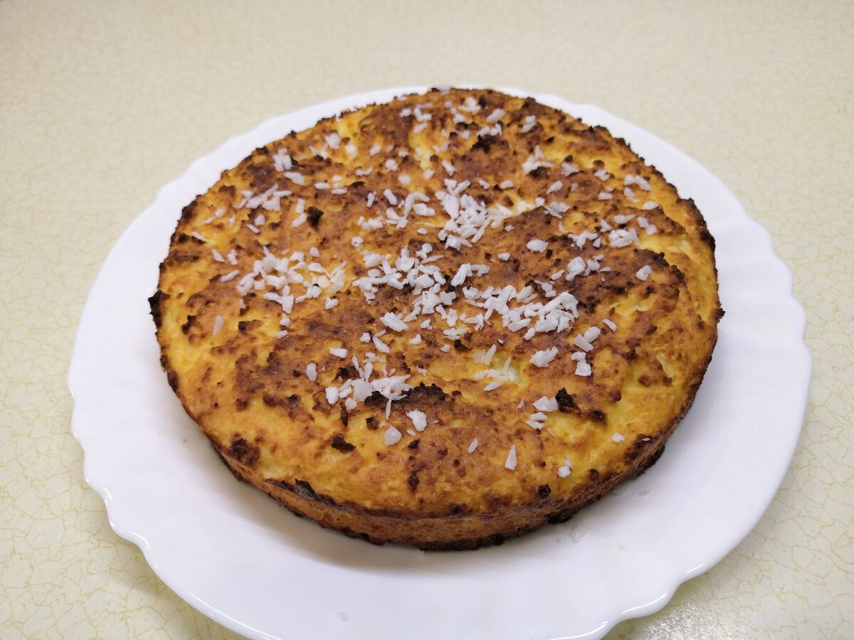 2. Затем добавьте рисовую муку, которая не только улучшит текстуру, но и сделает запеканку более воздушной. Хорошо перемешайте и после этого введите кокосовую стружку. В результате получится густое тесто.