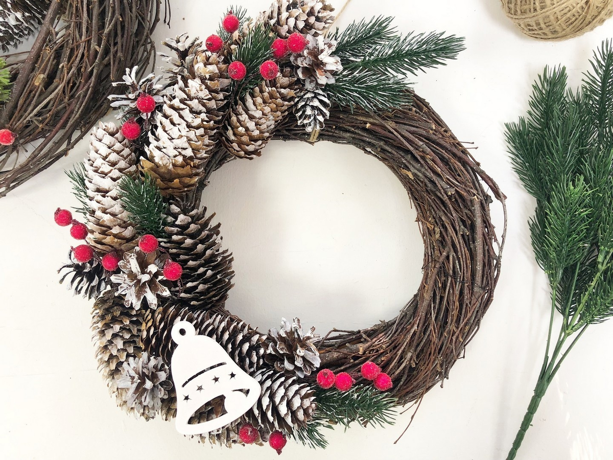 - Материалы: Прекрасно смотрится венок, сделанный из хвойных ветвей, таких как ель, пихта и сосна. Яркие ягоды, шишки и цветы, такие как пуансеттия, добавляют праздничный настрой.