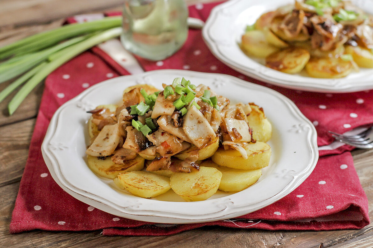 Шаг 4: На другой сковороде растопите сливочное масло, добавив немного растительного, чтобы оно не пригорело. Нарежьте отварной картофель кружочками и обжаривайте на среднем огне по 3-4 минуты с каждой стороны, до золотистого цвета. Подавайте картофель с обжаренными кальмарами незамедлительно.
