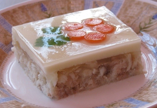Как только холодец застынет, можно украсить его по собственному вкусу. Для фиксирования украшений лучше всего использовать немного бульона.