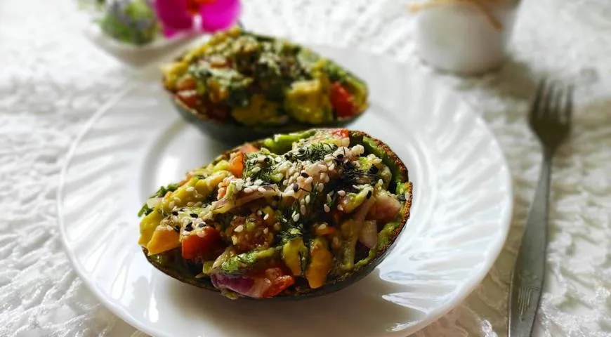 Шаг 4: Подавайте. Выложите получившуюся массу в половинки авокадо, украсьте свежей зеленью или семенами и подавайте на стол сразу же, чтобы сохранить свежесть овощей.