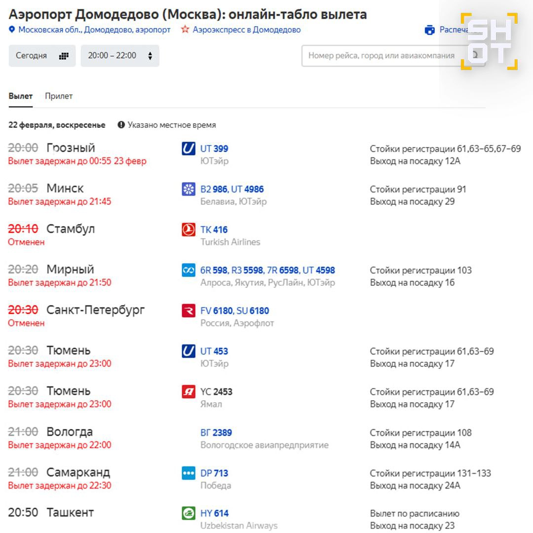 По данным SHOT, наибольшие трудности возникли в Шереметьево. Там задержаны 30 рейсов на вылет и 35 на прилёт. Во Внуково отменены 10 полётов: среди них направления в Питер, Уфу и Стамбул. В Домодедово задерживаются 20 самолётов.