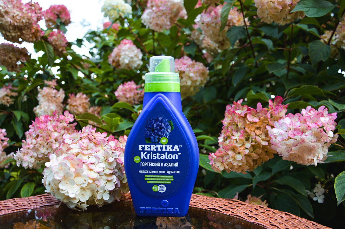 Для подкормки можно использовать специальное жидкое комплексное удобрение «Кристалон» компании Фертика, предназначенное для гортензий и азалий. Для его применения необходимо развести 10 мл (? колпачка) в одном литре воды и вносить под корень или опрыскивать по листву. Не стоит применять корневые и некорневые подкормки одновременно.