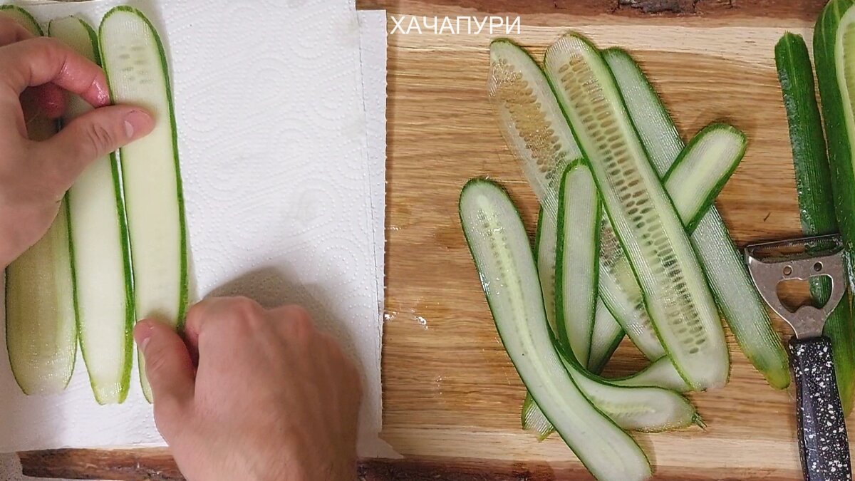 Для начала необходимо подготовить огурцы: их нарезают тонкими слайсами с помощью овощечистки и выкладывают на салфетки, чтобы избавиться от влаги.