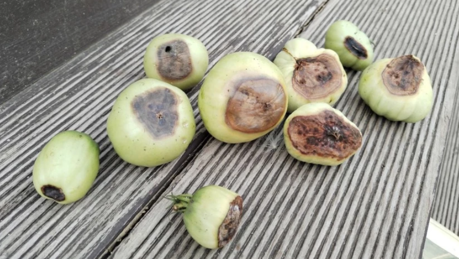 На вершине плода томата может появиться сухое зеленое пятно, которое постепенно увеличивается и становится водянистым, в результате чего внутрь может проникать инфекция. Это заболевание не является инфекционным, и его причиной служит нарушение минерального обмена — особенно нехватка кальция.
