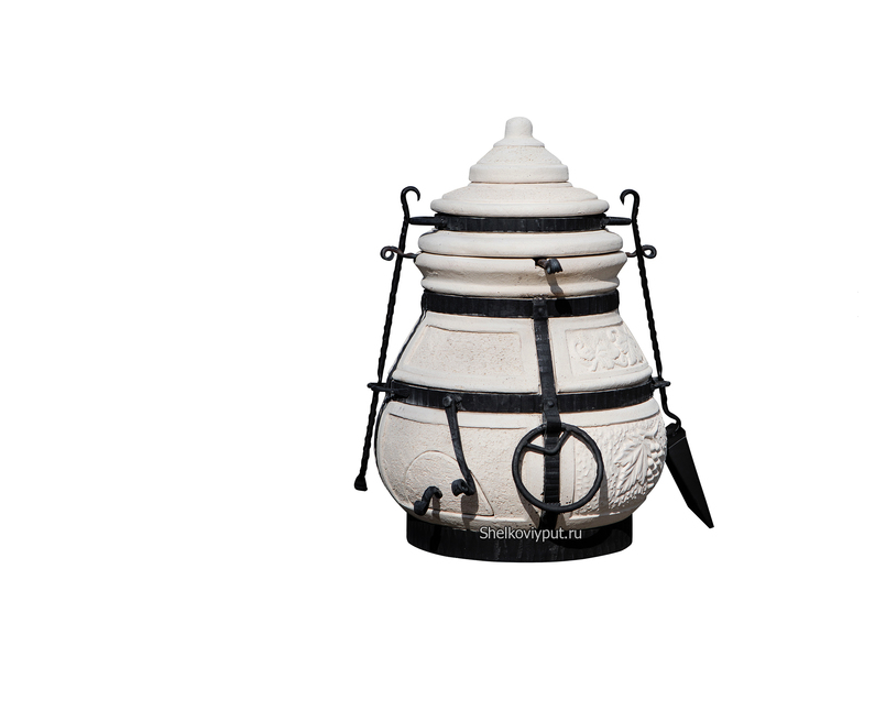 Тандыр выполнен из шамотной глины и украшен стильным орнаментом. Для безопасности он оборудован прочным металлическим ободом, к которому удобно крепить инструменты.