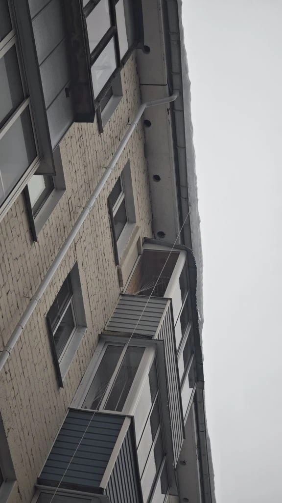 Теперь уже не сосульки свисают, а длинный пласт ледяной глыбы.