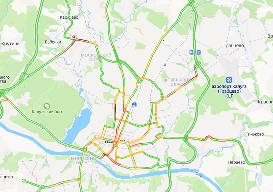 Заторы на улицах Набережной, Кутузова, Генерала Попова, Советской, Жукова, Телевизионной, Кирова, Московской, Ленина, Грабцевском шоссе.