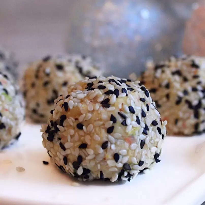 Затем соедините все ингредиенты в одной посуде и тщательно перемешайте до получения однородной массы. Из полученного теста сформируйте небольшие шарики и обваляйте их в кунжуте — это добавит блюду хрустящую нотку.
