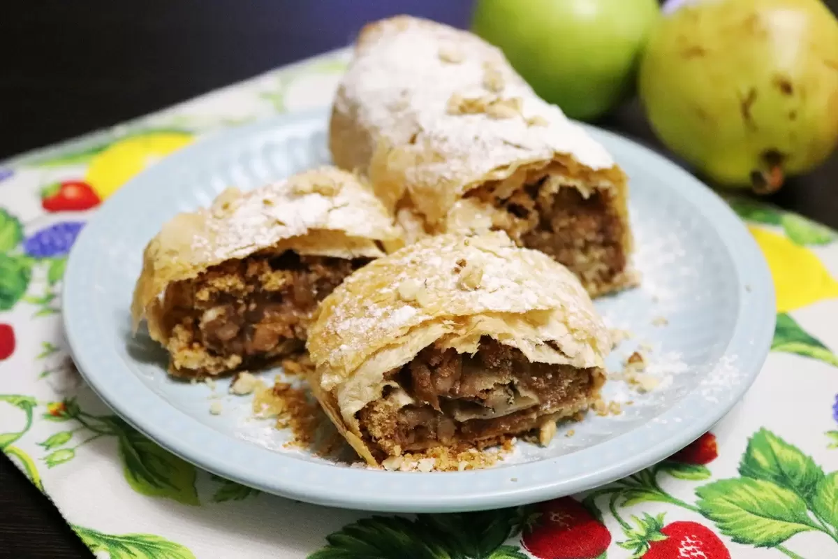 После приготовления дайте штруделю постоять под полотенцем 5-7 минут. Затем присыпьте его сахарной пудрой и нарежьте острым ножом на порционные кусочки. Этот десерт пленит сердца и вкусовые рецепторы всех гостей. Приятного аппетита!