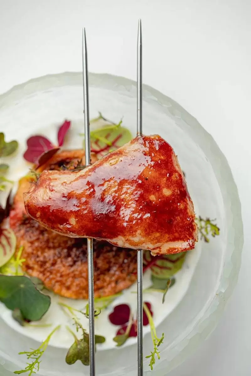 Ножка перепёлки, приготовленная на открытом огне, наслаждается восхитительным соусом хойсин. Этот соус придаёт блюду глубокий бархатный вкус с лёгкими нотациями дыма, создавая незабываемое гастрономическое впечатление.