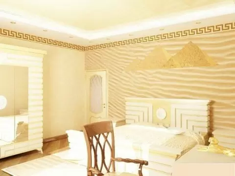 Непременным атрибутом станет живопись и фотографии, которые оформлены в египетском антураже. Для пола идеально подойдет светлая плитка с золотистыми прожилками или паркет. В центре можно разместить ковер с египетскими мотивами, который станет ярким акцентом.