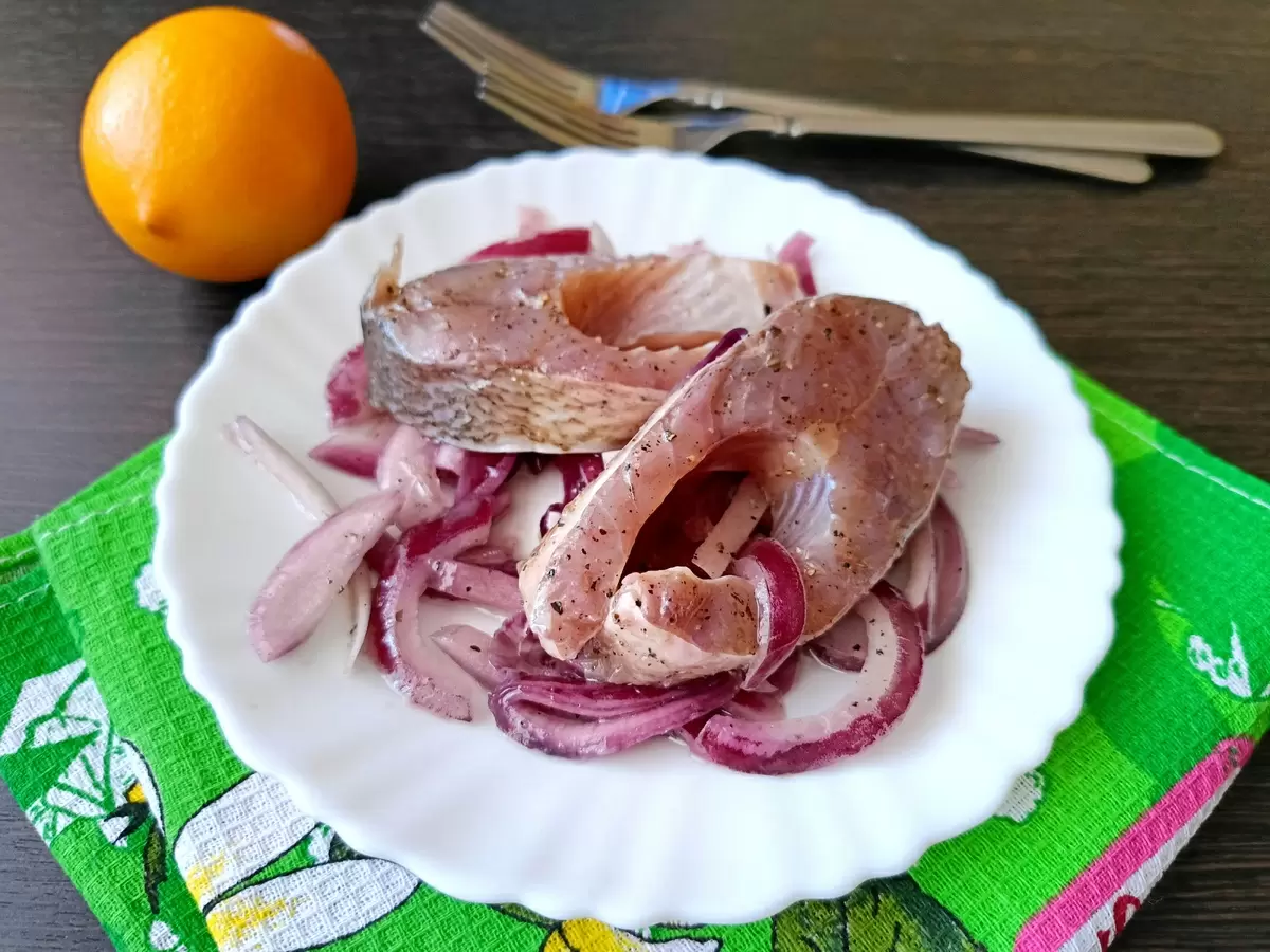 Лук следует нарезать полукольцами и слегка посолить. Добавьте к нему сок лимона или яблочный уксус, затем аккуратно помните его пальцами, чтобы он стал более мягким и ароматным. После этого укладывайте лук на подготовленную рыбу, полейте растительным маслом. Лучше всего использовать нерафинированное масло, так как оно придаёт дополнительный вкус.