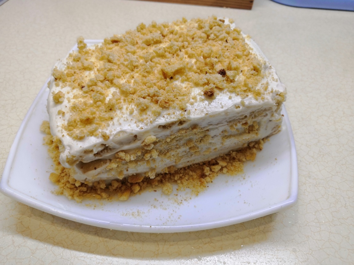 5. Собрать торт, чередуя коржи и крем, и щедро обсыпать крошкой по краям. После этого следует оставить десерт в холодильнике на несколько часов для пропитки.