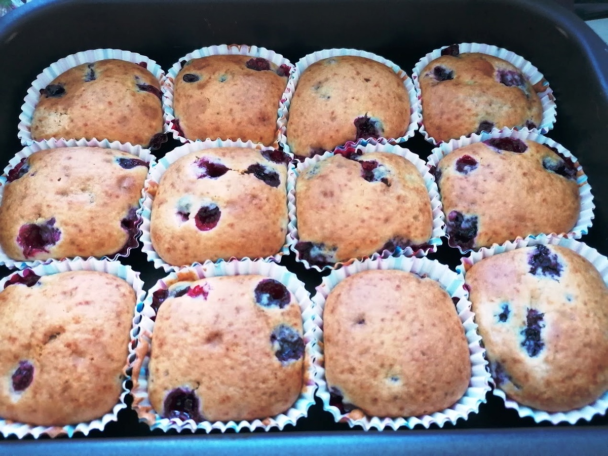 Приготовление: Разогреть духовку до 180°C, смешать сухие ингредиенты, отдельно взбить яйца с молоком и растительным маслом, затем объединить и добавить чернику. Выпекать до золотистого цвета.