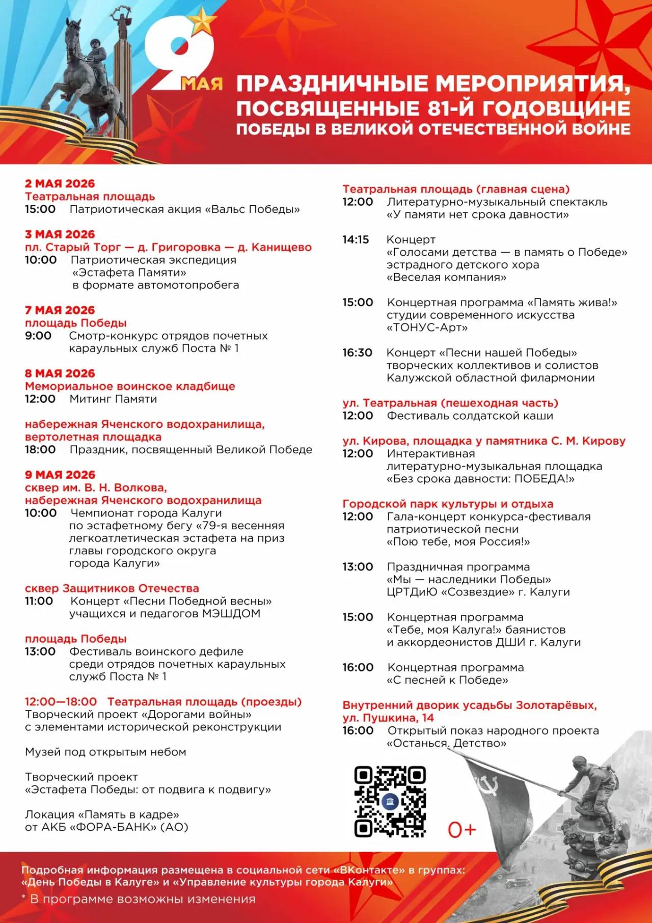 9 мая утром в сквере Волкова пройдёт легкоатлетическая эстафета, а на Театральной площади калужан и гостей города ждут концерты, музей под открытым небом, горячая вкусная каша и праздничные площадки.